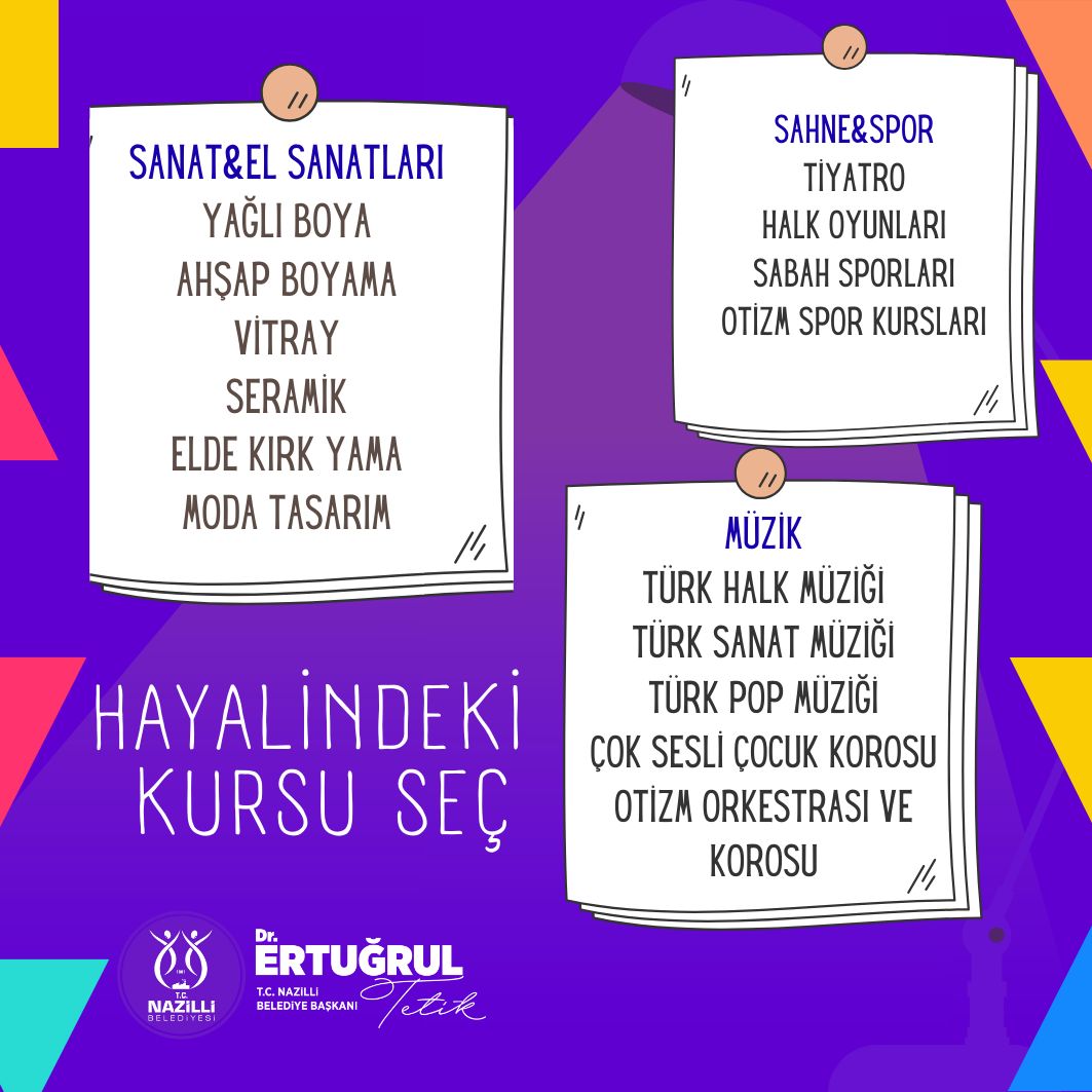 Nazilli Belediyesi, kültür, sanat ve spor alanlarında vatandaşlara yönelik ücretsiz kurslarını aralıksız sürdürüyor. Her yaştan bireye hitap eden ve toplam 14 farklı branşı kapsayan kurslarla ilçede sosyal ve kültürel yaşamın canlandırılması hedefleniyor.