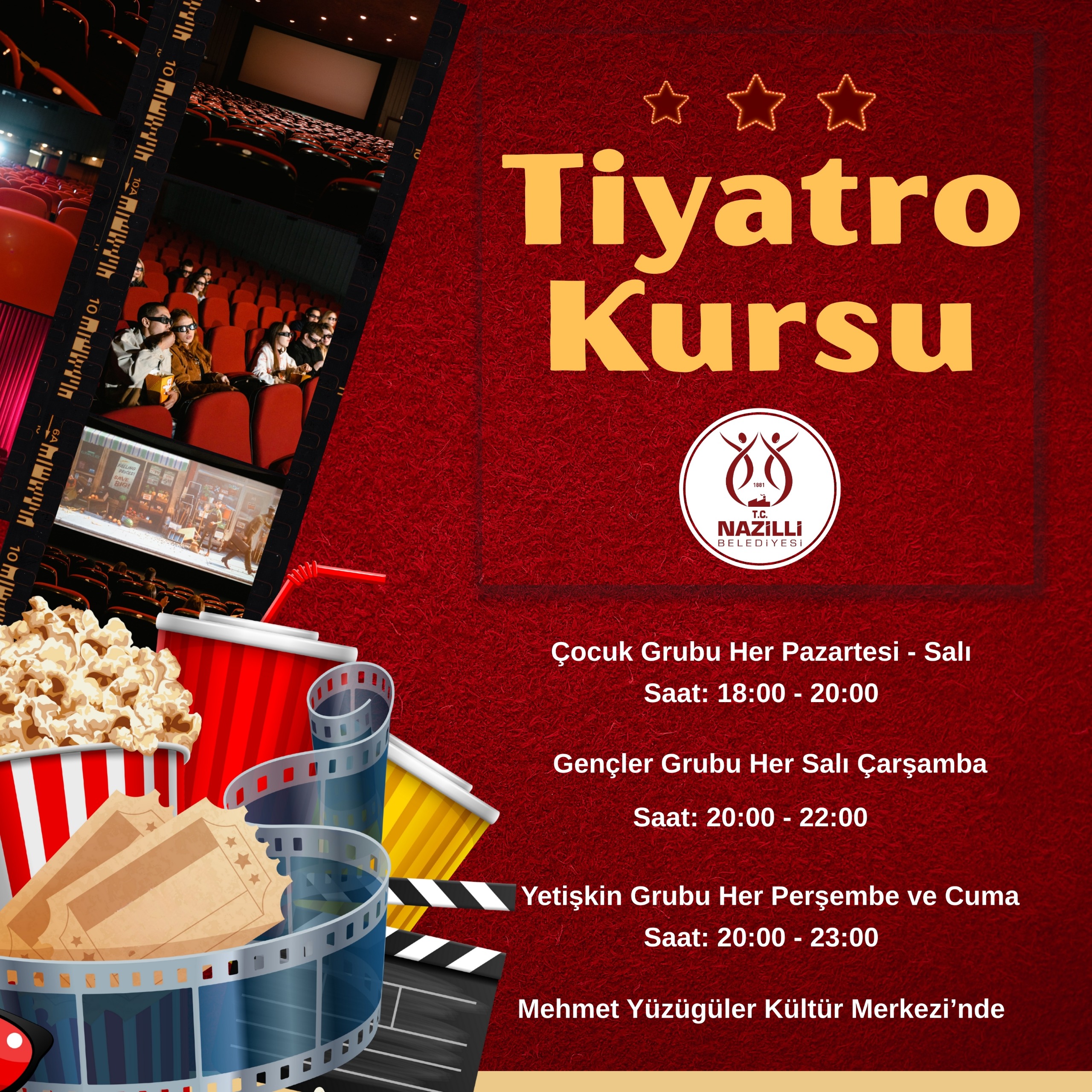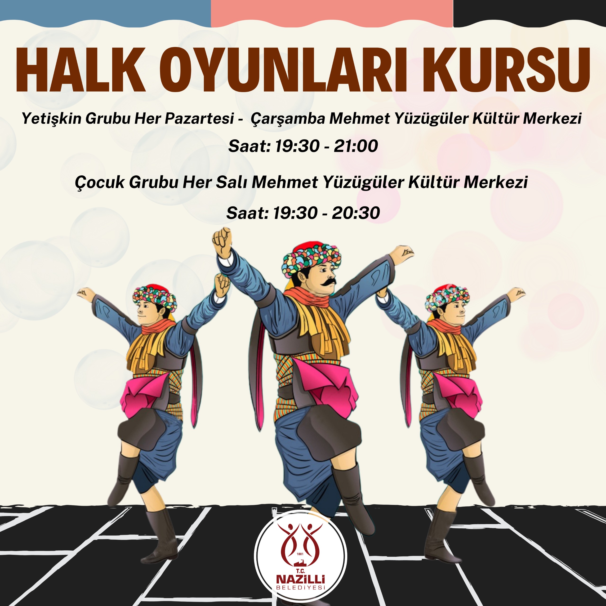 Halk oyunları kursu yetişkinler için pazartesi ve çarşamba günleri 19.30–21.00, çocuklar için ise salı günleri 19.30–20.30 saatleri arasında yapılıyor. Tiyatro kursları ise yaş gruplarına göre planlandı. 7–9 yaş grubu çocuklar pazartesi ve salı günleri 18.00–20.00 saatleri arasında, gençler salı ve çarşamba günleri 20.00–22.00 saatleri arasında, yetişkinler ise perşembe ve cuma günleri 20.00–23.00 saatleri arasında Mehmet Yüzügüler Kültür Merkezi’nde eğitim alıyor.